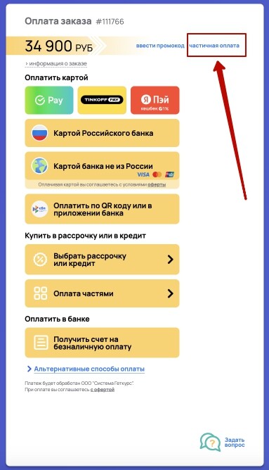 2. Нажать на кнопку "Перейти к частичной оплате"